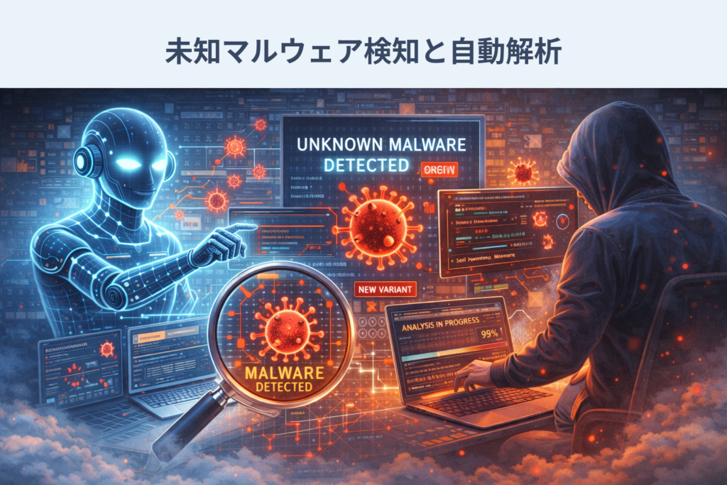 AIのディープラーニング技術は、マルウェア対策にも革新をもたらしています。AIに過去の悪性プログラムの特徴を学習させることで、既知のマルウェアだけでなく、未知の新種や変異型マルウェアまで高精度に検知できるようになります。近年、攻撃者側もAIを組み込んで自己変異・自己学習する高度なマルウェアを開発しつつあり、従来型のパターンマッチングでは対応が難しくなっています。しかし、防御側もAIモデルにマルウェアの挙動パターンを学習させることで、コードが変異しても共通する不審な動作からその正体を見抜くことが可能です。