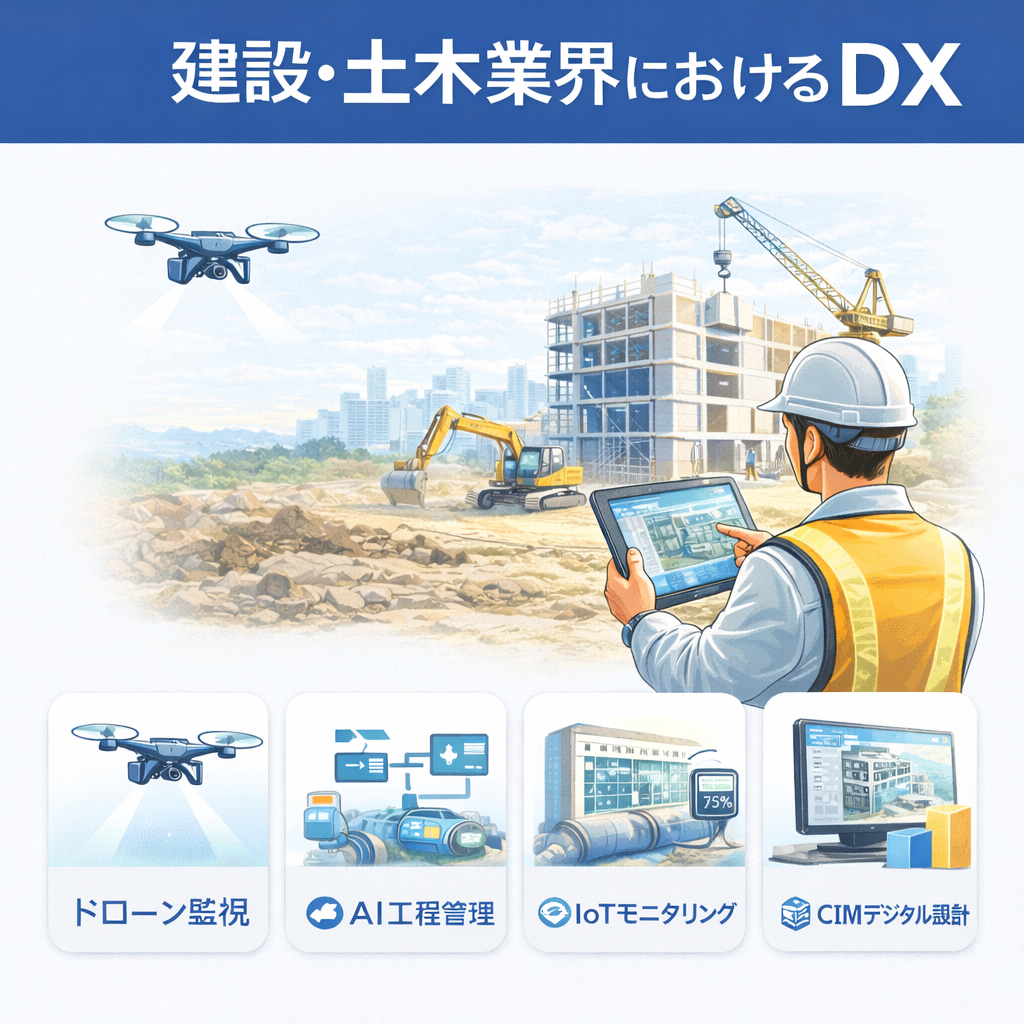 建設・土木: 施工管理や安全管理の効率化。ドローン監視やAI工程管理で施工ミスを削減し、現場の安全性・生産性を向上。たとえば、ある建設会社ではデジタル施工管理システム導入により、管理業務時間を約30%削減しました。
